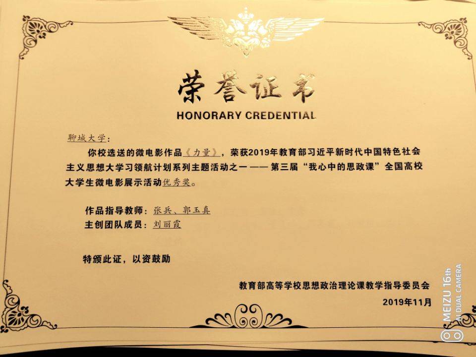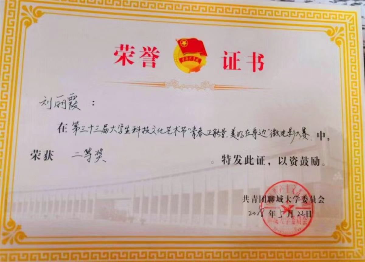 刘丽霞,第三十三届大学生科技文化艺术节微电影大赛二等奖