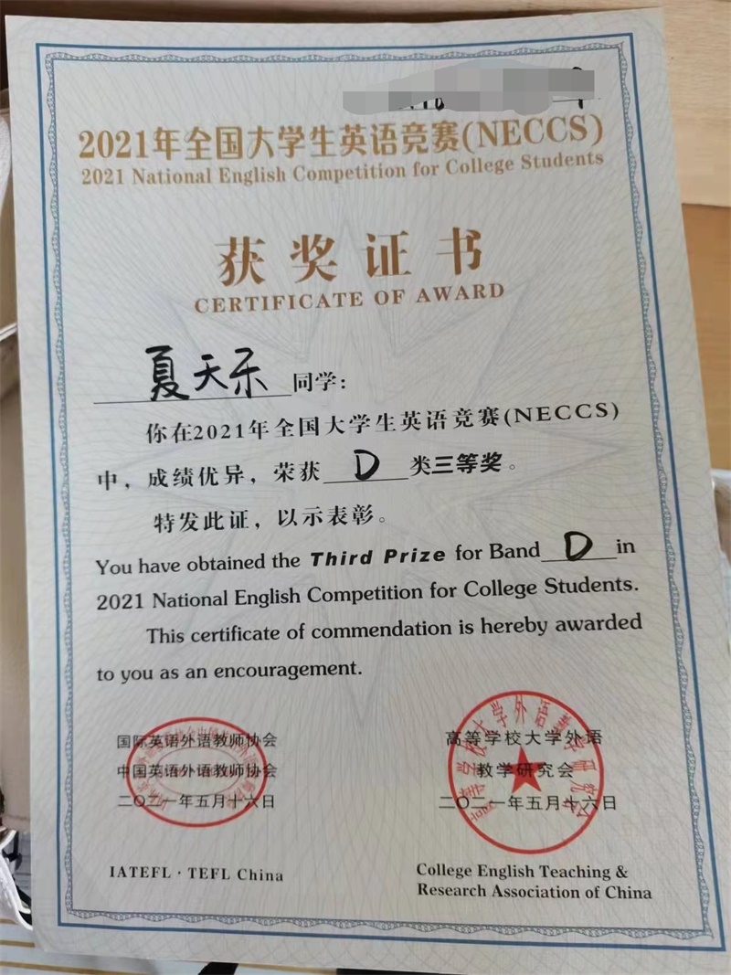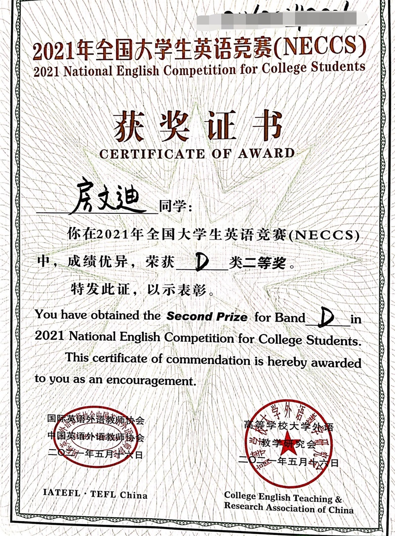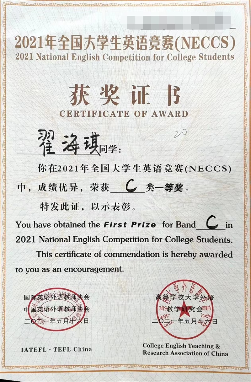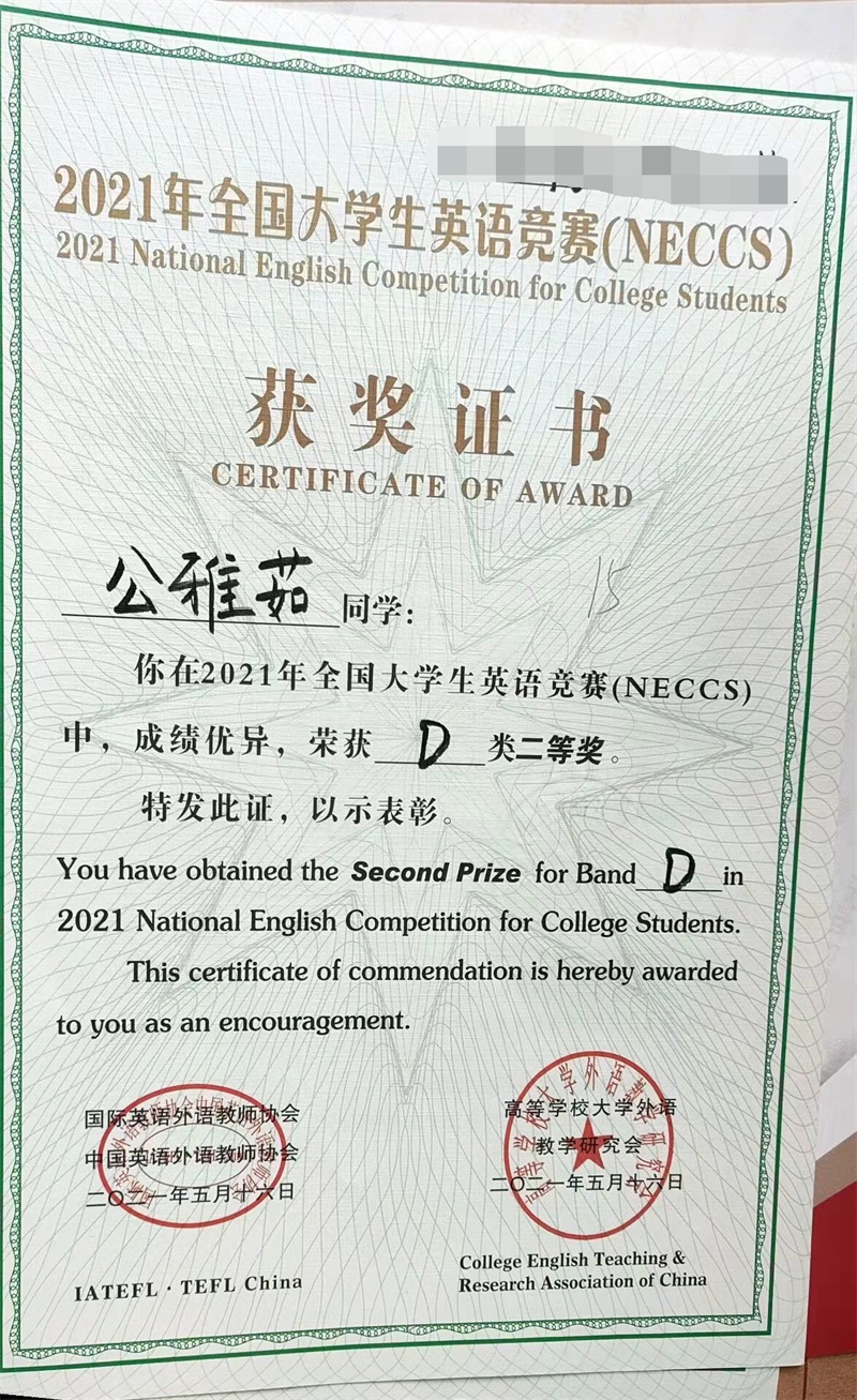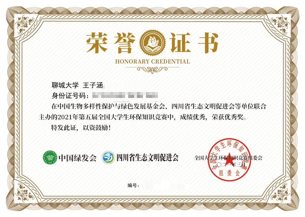 王子涵,2021年第五届全国大学生环保知识竞赛优秀奖