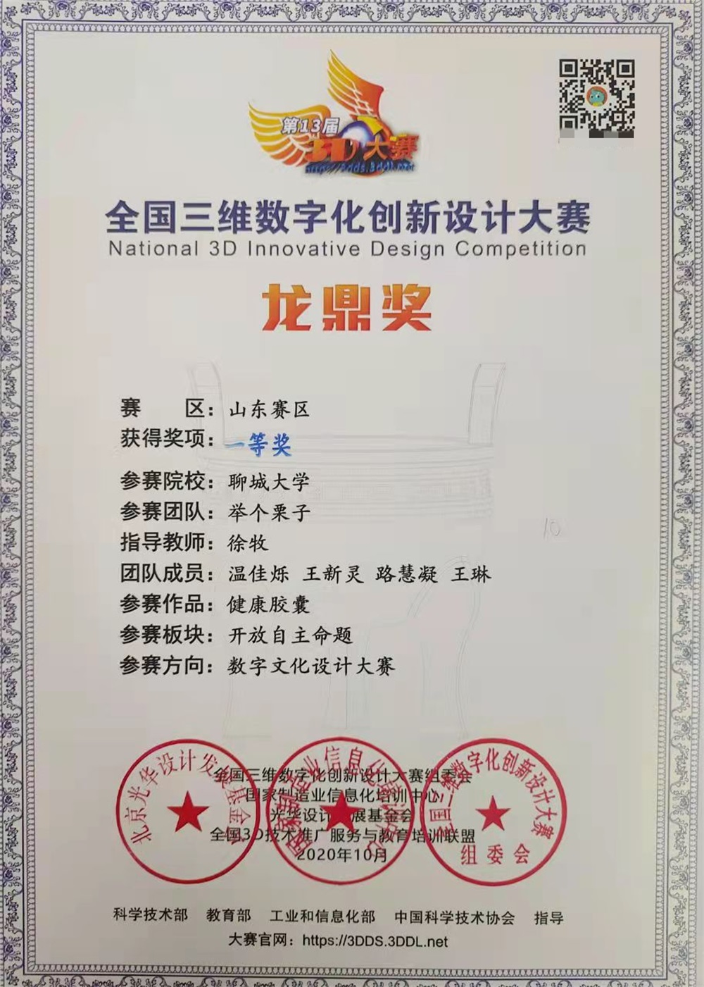温佳烁、王新灵、路慧凝、王琳,全国三维数字化创新设计大赛一等奖