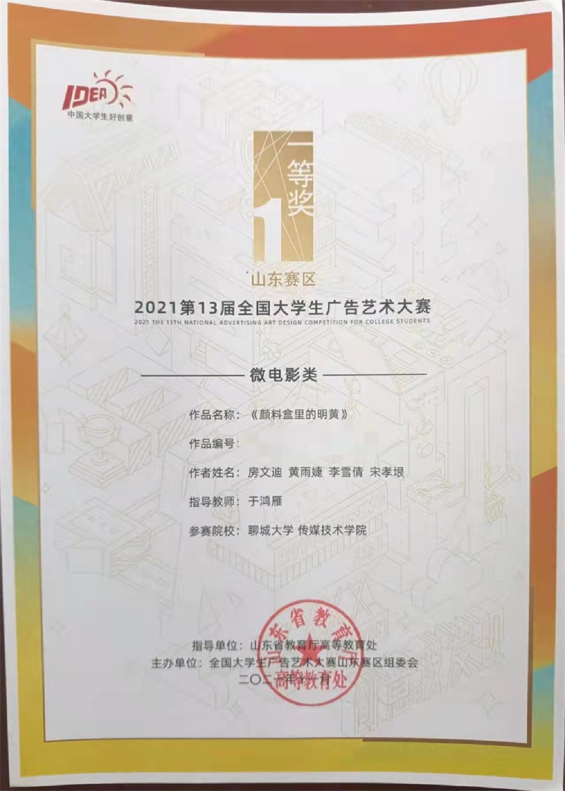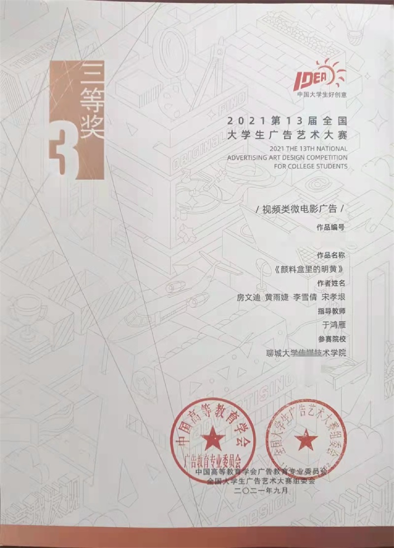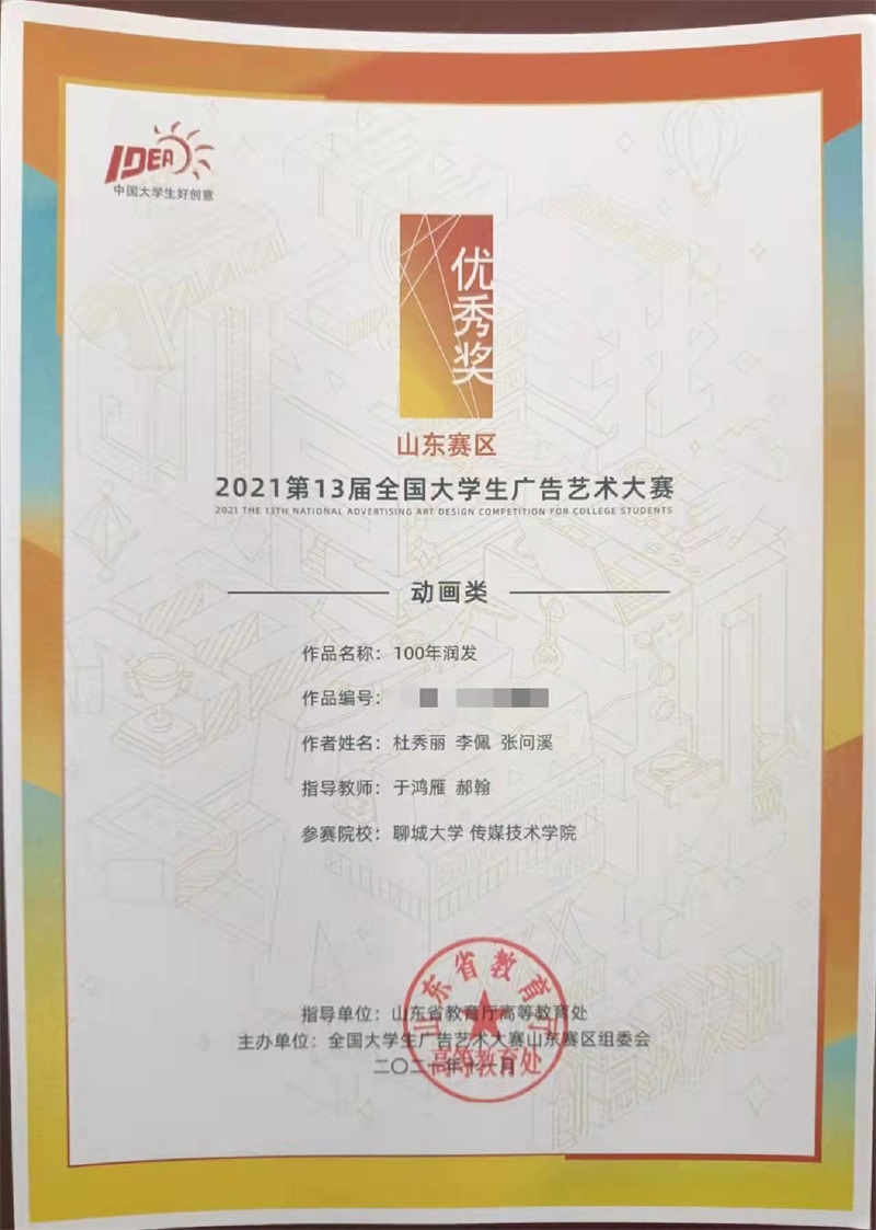 杜秀丽、李佩、张问溪,2021第13届大学生广告艺术大赛优秀奖(山东赛区)