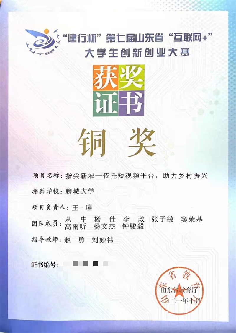 王瑾、丛中、杨佳、李政、张子敏、窦荣基、高雨昕、杨文杰、钟骏毅,“建行杯”第七届山东省“互联网+”大学生创新创业大赛铜奖