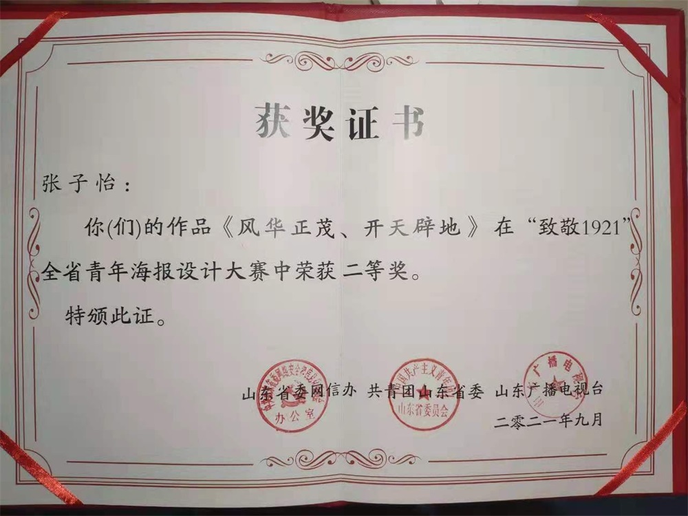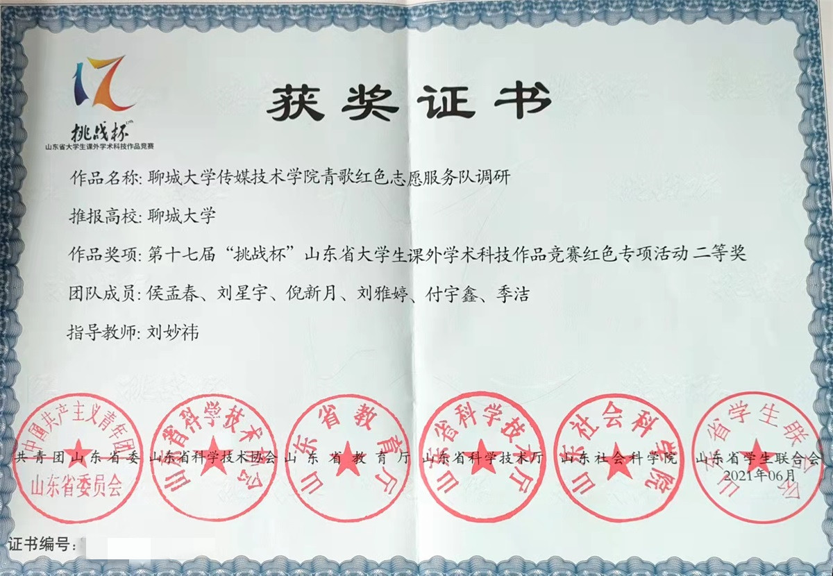 侯孟春、刘星宇、倪新月、刘雅婷、付宇鑫、季洁,第十七届“挑战杯”山东省大学生课外学术科技作品竞赛红色专项活动二等奖