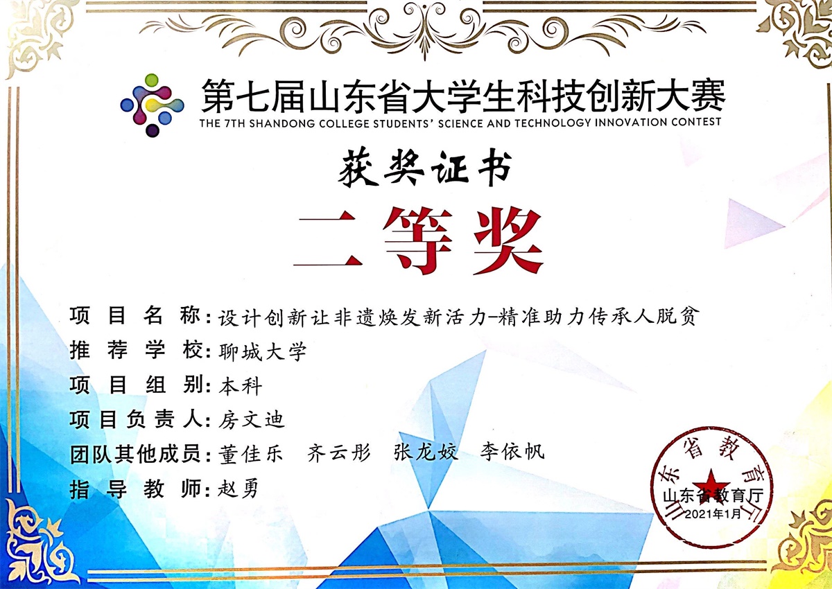 房文迪、董佳乐、齐云彤、张龙姣、李依帆,第七届山东省大学生科技创新大赛二等奖
