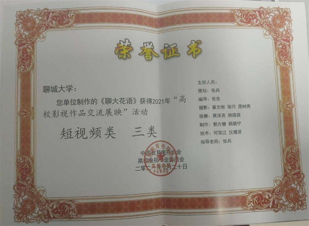 王新蕊,第三届“青春中国”山东省大学生微电影大赛最佳短视频奖
