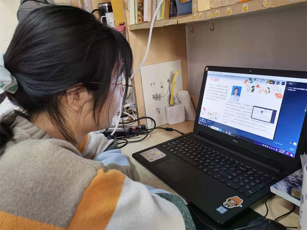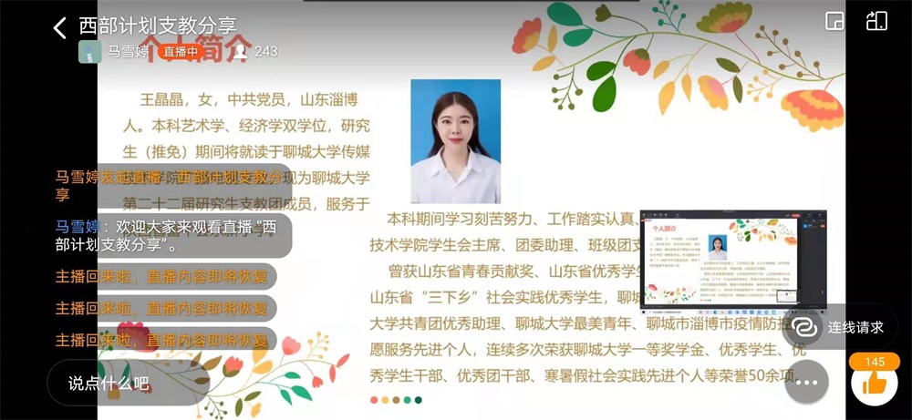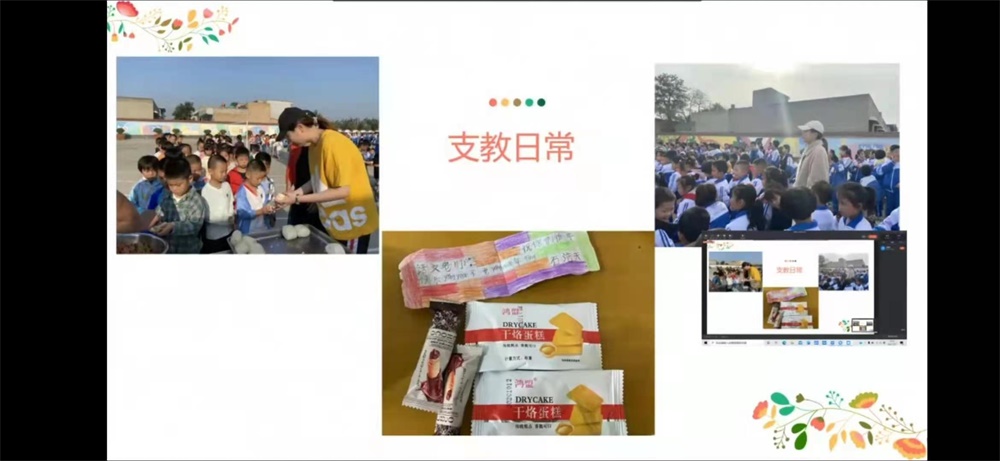 本次活动采用钉钉平台直播的形式进行。王晶晶和李锦娜两位同学就自身服务西部的实际支教生活和大学学习经验进行介绍,让同学们对西部计划形成一个正确的认识和了解。王晶晶同学结合自身大学学习和生活的经验向同学们提出了学习、工作、生活、自律四个方面的建议,并通过讲解PPT为同学们展示了自己的支教生活,讲述了自己在支教工作中的收获,其中所播放的短视频充分展现了陕西省渭南市富平县东新小学学生们的童趣和欢乐以及王晶晶作为支教老师的骄傲,她表示自己有决心通过教书育人、扶贫济困,为建设西部美好明天做出自己的一份贡献。